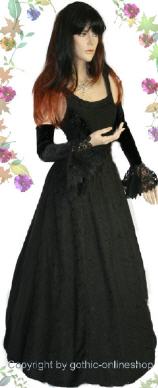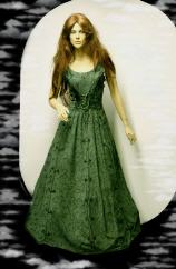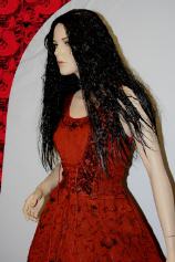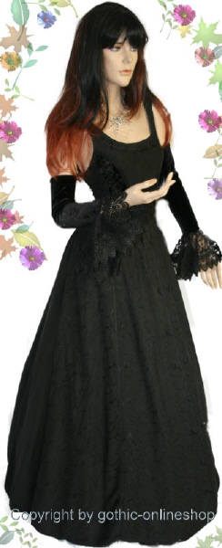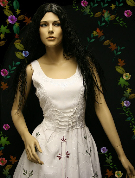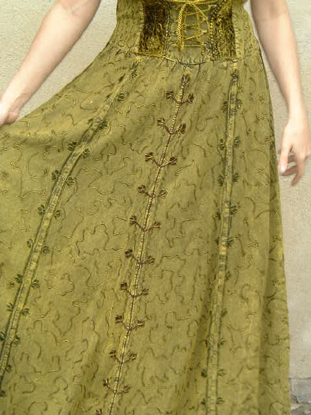 Das Kleid wird oben im Frontbereich miederartig geschnürt und erhält zum Saum hin viel Weite. Es ist knöchellang, die Träger sind gerade so breit, dass auch ein BH angezogen werden kann.