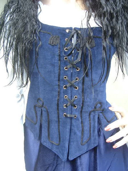 Das Mieder ist natürlich komplett durchgeschnürt und wurde mit schwarzen Borten verziert. Hinten befindet sich noch eine kleine Schnürung, mit der sich die Taillenweite regulieren lässt. Miedertop: Material: 100% Baumwollsamt