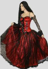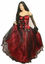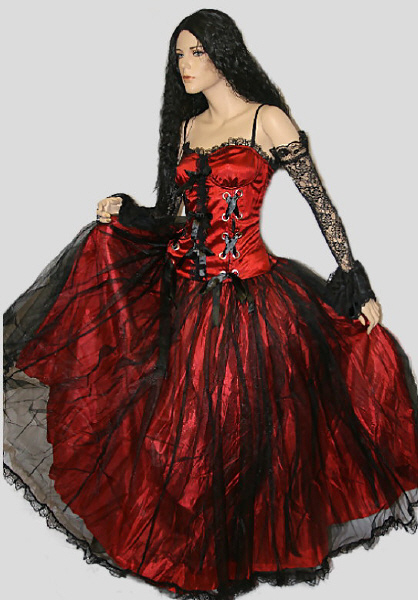 doppelter Miederschnürung mit O-Ringen sowie einem superweiten und tief angesetztem bauschigen Rock aus schimmerndem Satin, Chiffon und Tüll.