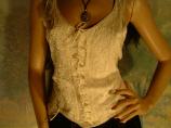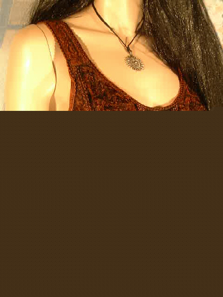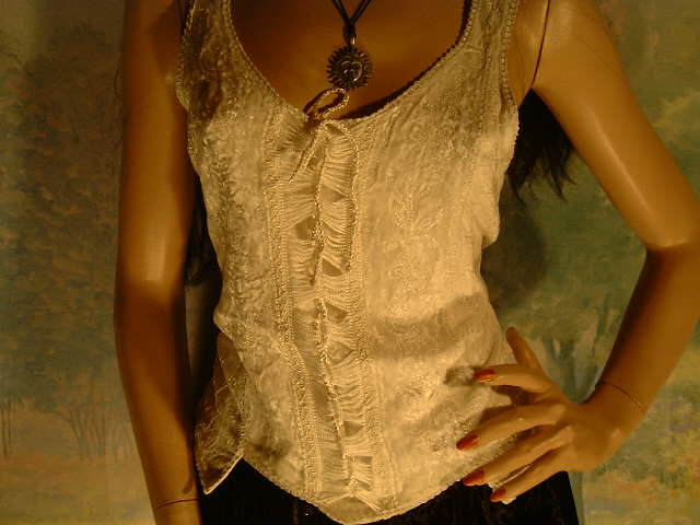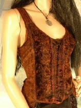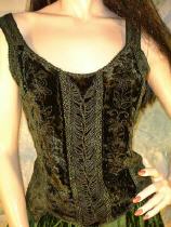 Das Oberteil wurde mit Kurbelstickerei und einer filigranen Zierschnürung versehen. Das Top ist aus dem angenehm zu tragenden Stoff Viskose. Viskosestoff und Viskosesamt wurden bei diesem Teil harmonisch miteinander verbunden.