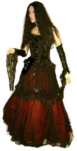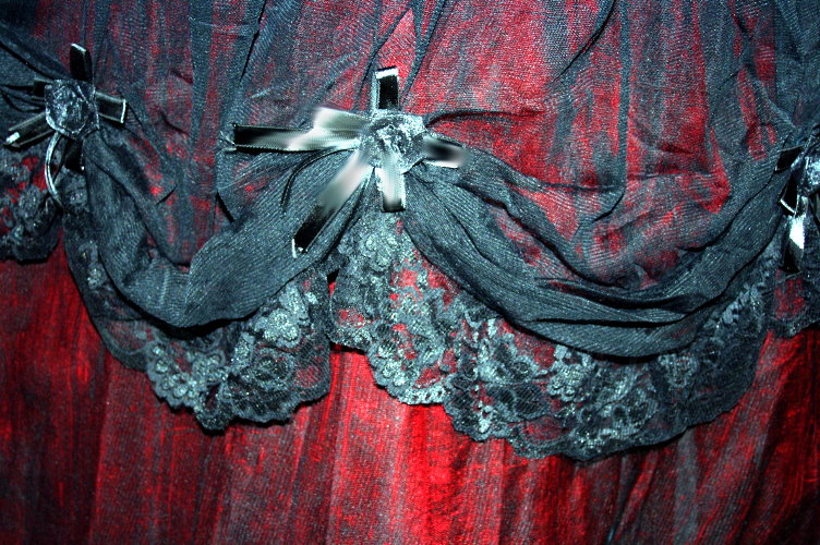 Darüber fällt ein weiterer Rock aus feinem zarten Netzgewebe. Eine weitere und zwar die oberste Lage aus feinstem Netz-Gewebe wurde ringsum bogenförmig gerafft und mit Rosen aus schwarzem Satin verziert.