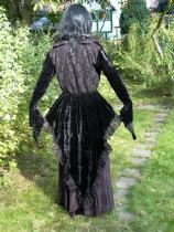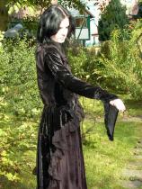 Eine absolute Hexenjacke. Vorne kurz, hinten mit Schleppe. Viel Samt, umsäumt von schwarzer Spitze. Ein ideales Teil für Euer düsteres Outfit. Und hammermäßig zu engen Röcken.