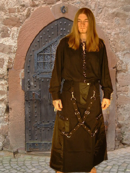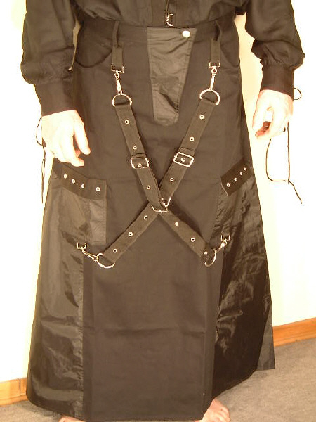 Bondagerock " D u n g e o n "Dieses megageile Stück präsentiert sich natürlich wie es sein muß - in tiefstem Schwarz.Ein gelungener Kontrast zu den Nieten und Karabinerhaken in Metall.Wenn´s mal etwas einfacher sein soll, könnt ihr die Strapse/Gurte aber auch abnehmen ..... ;- )