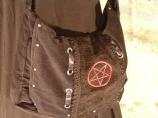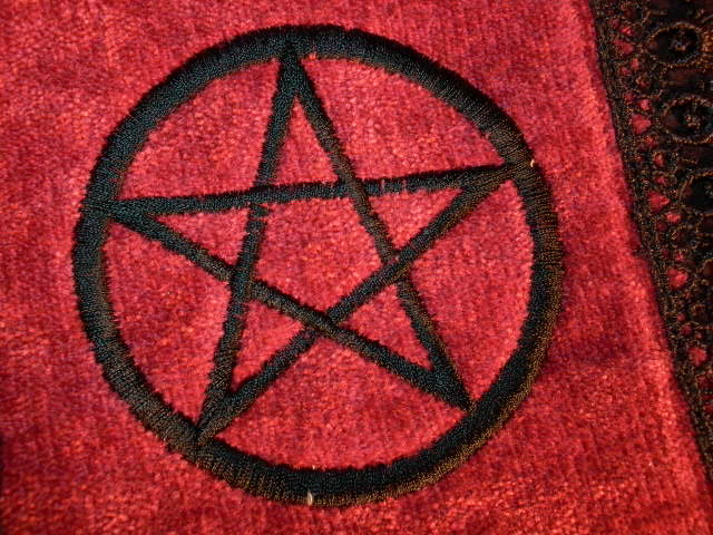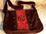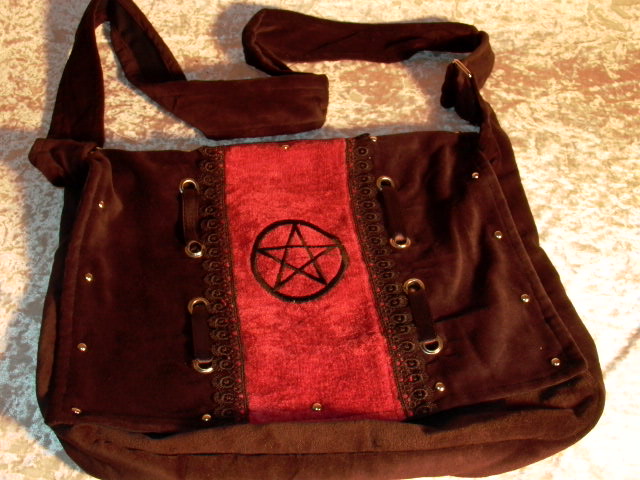 Samttasche mit geschlossenem eingestickten Pentagramm, Nieten und Oesenverzierungen