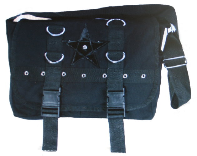 Umhängetasche mit verstellbarem Trageriemen aus fester schwarzer Baumwolle und Stern-Applikation sowie D-Ring- und NietenverzierungenMaße: 40 x 30 cmMaterial: reine Baumwolle