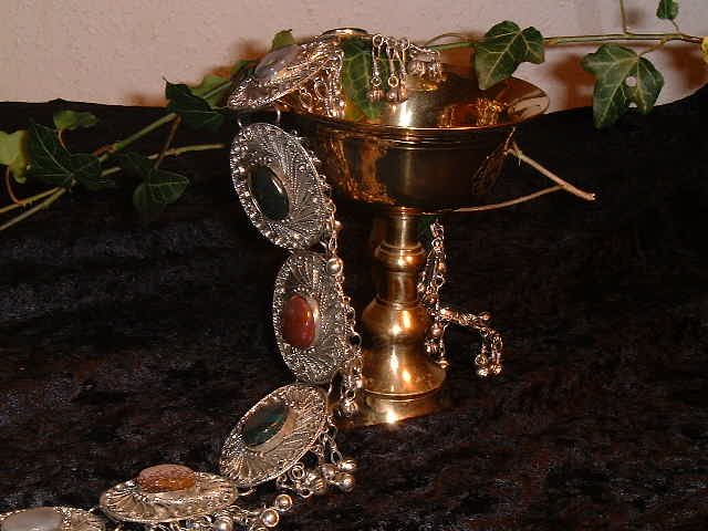 Auch in diesen Gürtel wurden viele Steine eingebracht; auch hier wurden viele kleine Glöckchen befestigt.Maße: Länge etwa 90 cm