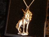 Einhorn-Amulett " S T E R N E N F E U E R "Einfach märchenhaft ist dieser wunderschöne Anhänger aus der Galraedia-Kollektion.Er wurde aus versilbertem bzw. vergoldetem nickel- und bleifreiem Zinn gefertigt und misst ca. 3,5 x 1,5 cm.Verziert wurde er mit eisblauen Swarovski-Kristallen.