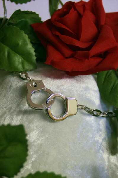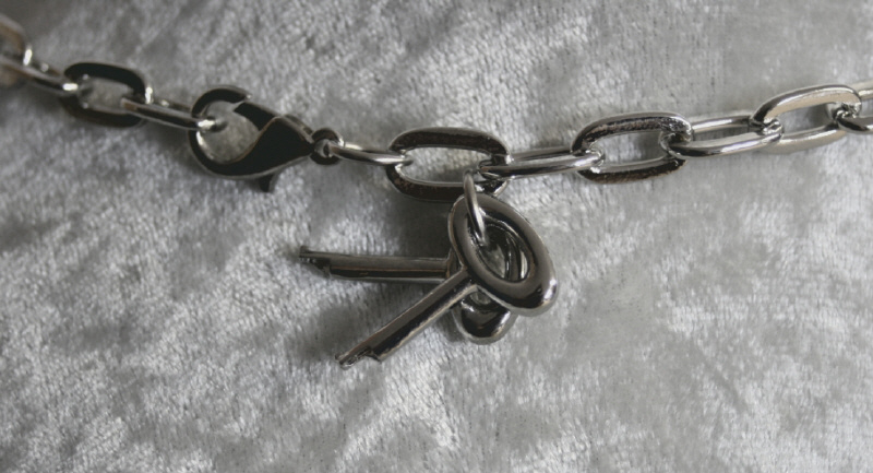 Halsnahes Collier mit Handschellen und passenden Schlüsseln. Das Schmuckstück wird mit einem Karabinerhaken geschlossen. Witzig: mit dem mitgelieferten Schlüssel lassen sich die Handfesseln öffnen bzw. schließen