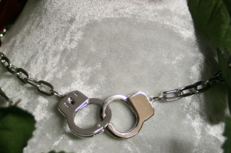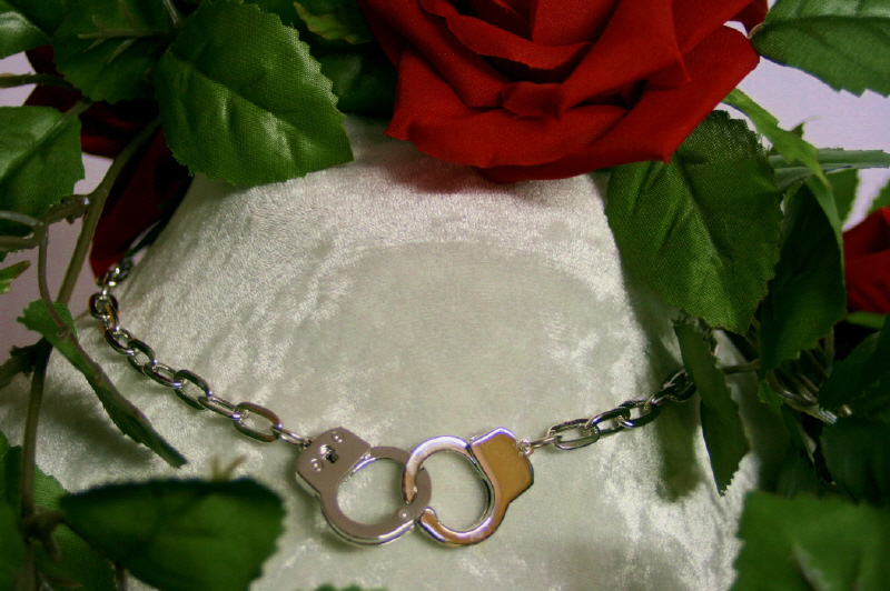 Maße: Länge des Colliers etwa 41 cm, Größe der Handschellen circa 4 x 2 cm