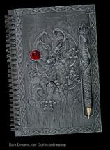 Auf der Rückseite befindet sich ein Drachen-Tribal mit einem Durchmesser von etwa 9 cm. Das Buch selbst hat die Maße 21,5 x 14,5 cm und ist 1,5 cm dick. Dazu gehört ein Kugelschreiber in der Form einer Drachenfigur. Das Schattenbuch ist eine ganz persönliche Angelegenheit. Wenn es bei Euch eintrifft ist es noch leer. Und es wird sich allmählich füllen mit Eueren Zaubersprüchen, Rezepten und Ritualanleitungen.