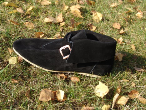 Mittelalterliche Schuhe mit Gummilaufsohle aus Velourleder mit einer seitlichen Schnalle aus verkupfertem Eisen (nickelfrei).